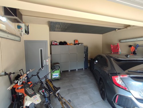 A pie de calle encontramos la zona del garaje con capacidad para 1 vehículo y excelentes zonas ideales para destinar como trastero/almacén. En el garaje encontramos un montacargas/ascensor que nos lleva desde el interior del garaje al exterior de la planta principal.