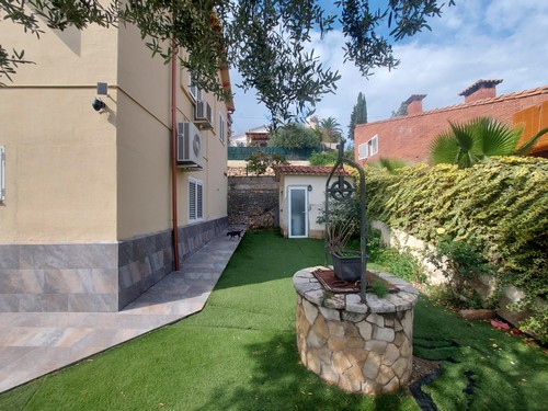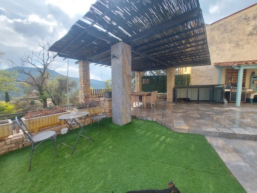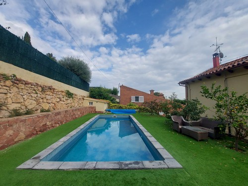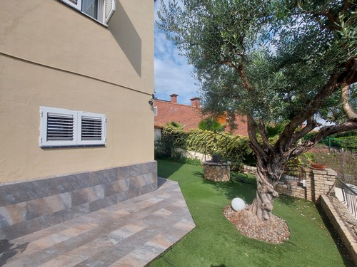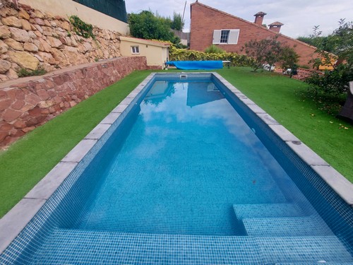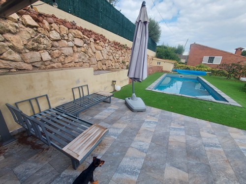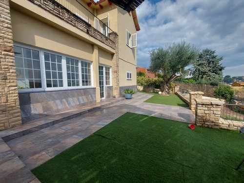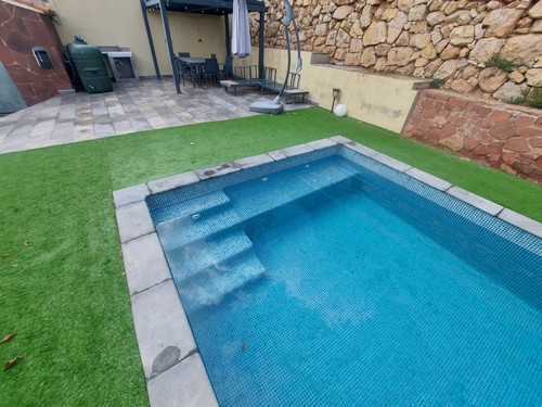 En el exterior encontramos varias zonas ajardinadas, preciosos porches con zonas chillout, terrazas y la gran piscina rodeada de césped artificial en la parte trasera de la vivienda.