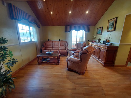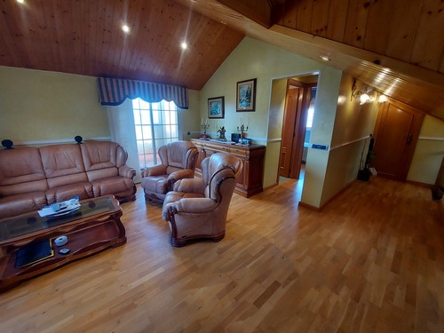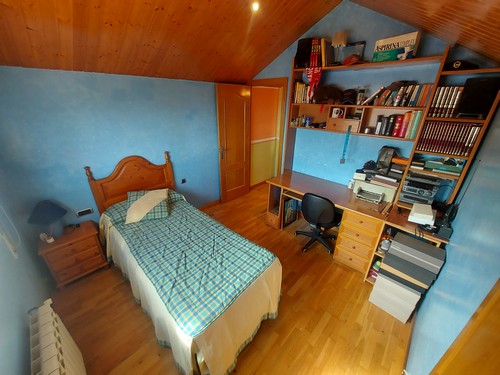 Planta Superior: En esta altura encontramos una bonita sala polivalente con techos altos revestidos de madera que aportan una gran sensación de calidez, además de una habitación doble ideal para invitados o para destinar como despacho. Desde aquí accedemos al solárium, perfecto para disfrutar de las vistas despejadas y del sol durante todo el día.