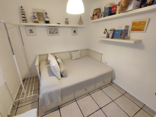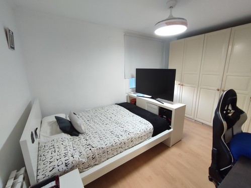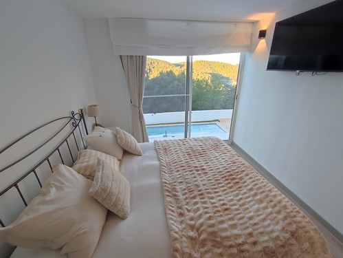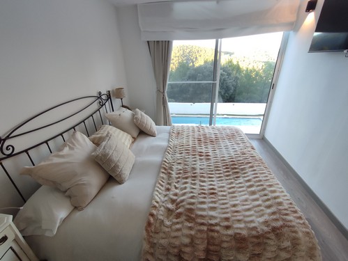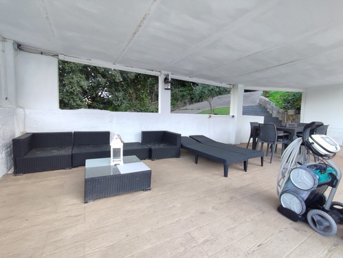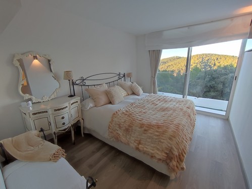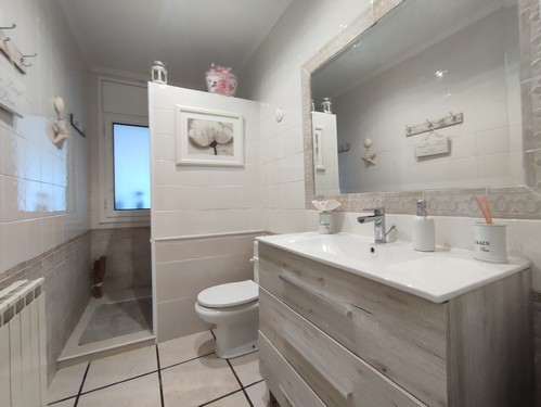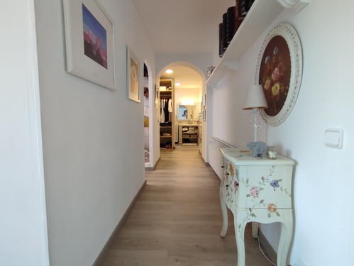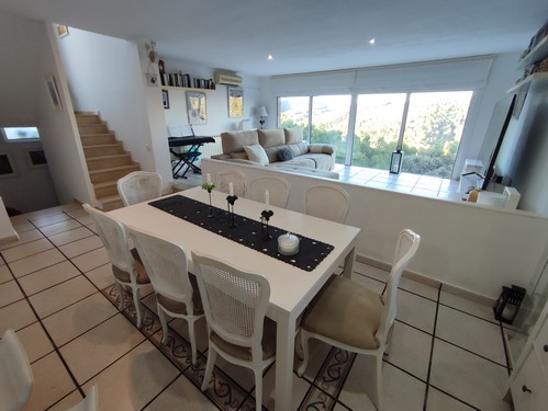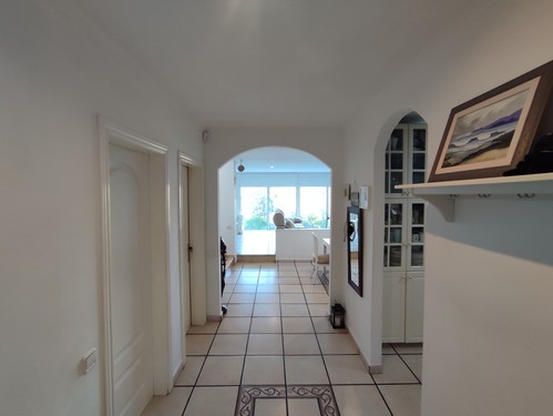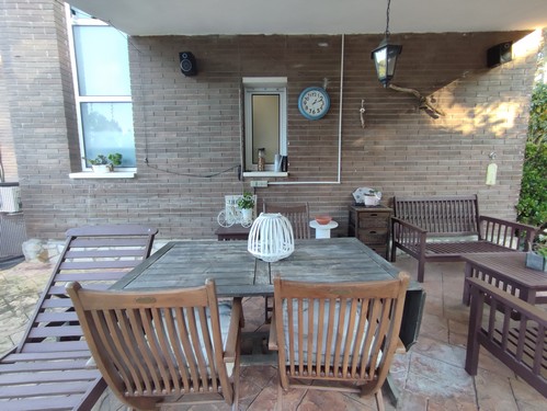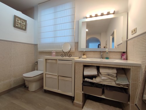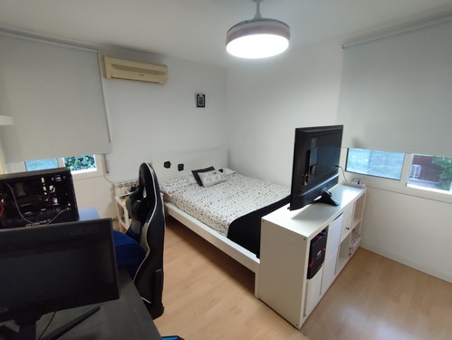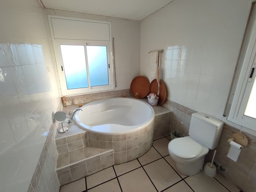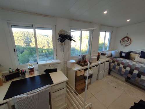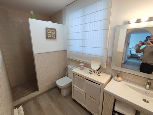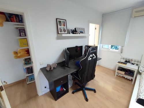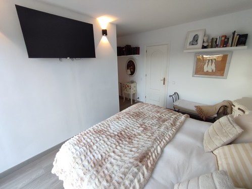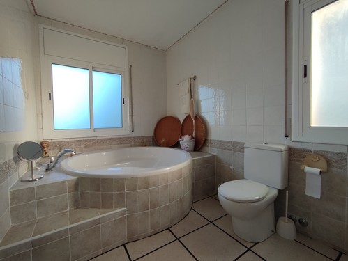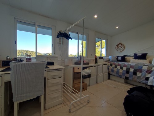 La planta superior dispone de dos habitaciones dobles con armarios empotrados, que comparten un baño con ducha y una gran bañera. En esta misma altura encontramos una terraza cubierta actualmente convertida en sala, perfecta como espacio adicional adaptable a distintos usos.